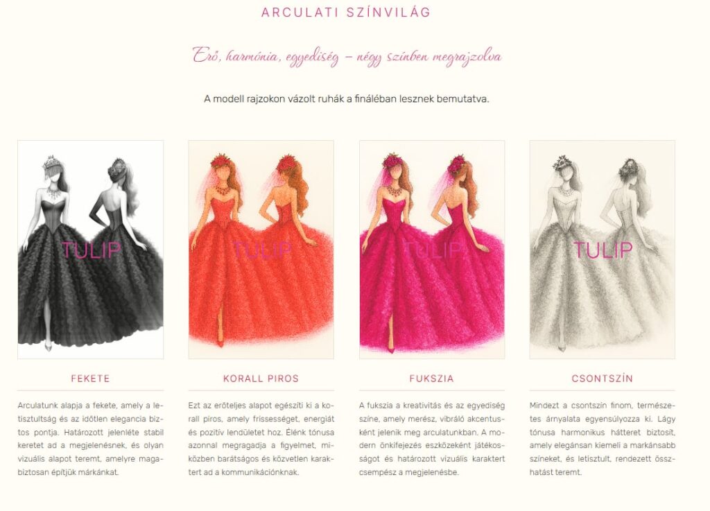Stabil alap amire építhetek tovább. A márka alapjaiban hasonló, a korábbi piros tulipán mint szimbólum továbbra is a fő jelképe a márkámnak, ahogyan az életem során végig fontos mérföldkövekhez kapcsolódik mint szimbólum. Így az alap és a név marad. A márka letisztultabb és modernebb lett, kikerültek alnevek a logóból. A színeket tudatosan választottuk szabványosított kódokkal láttuk el és kreatív nevet határoztunk meg az arculati könyvben. Építettünk bele kreatív elemeket és innovációt a korall piros és fukszia színek kombinációjával. Tovább gondoltam és ötvöztem. A kollekcióm is a kombinatorikára épül. Olyan anyagokat párosítok a ruhaiparban ami nem szokványos hanem egyedi és különleges hatást kelt a minőség és a fiziólógiai elvárások mellett.